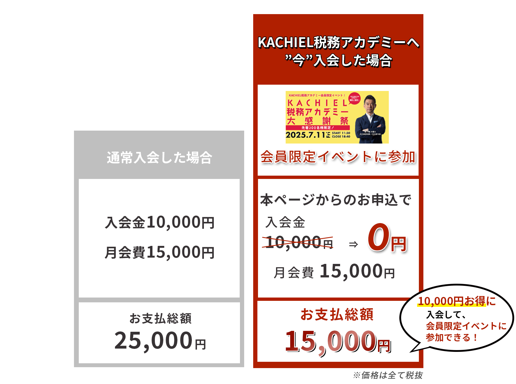 KACHIEL税務アカデミー会員のみ参加可能 ・会場参加:60,000円(税抜) ・オンライン:90,000円(税抜) |
