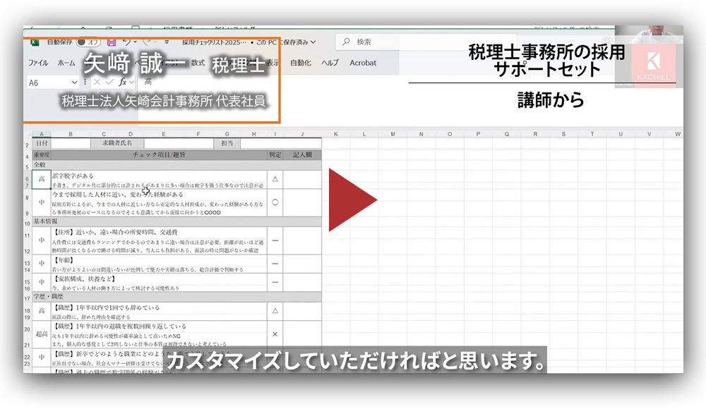 面接チェックリストや評価シートなど各ツールの効果的な使い方を解説。さらに矢崎会計が実際に運用している採用基準の考え方も学べる、実務直結の特別動画です。