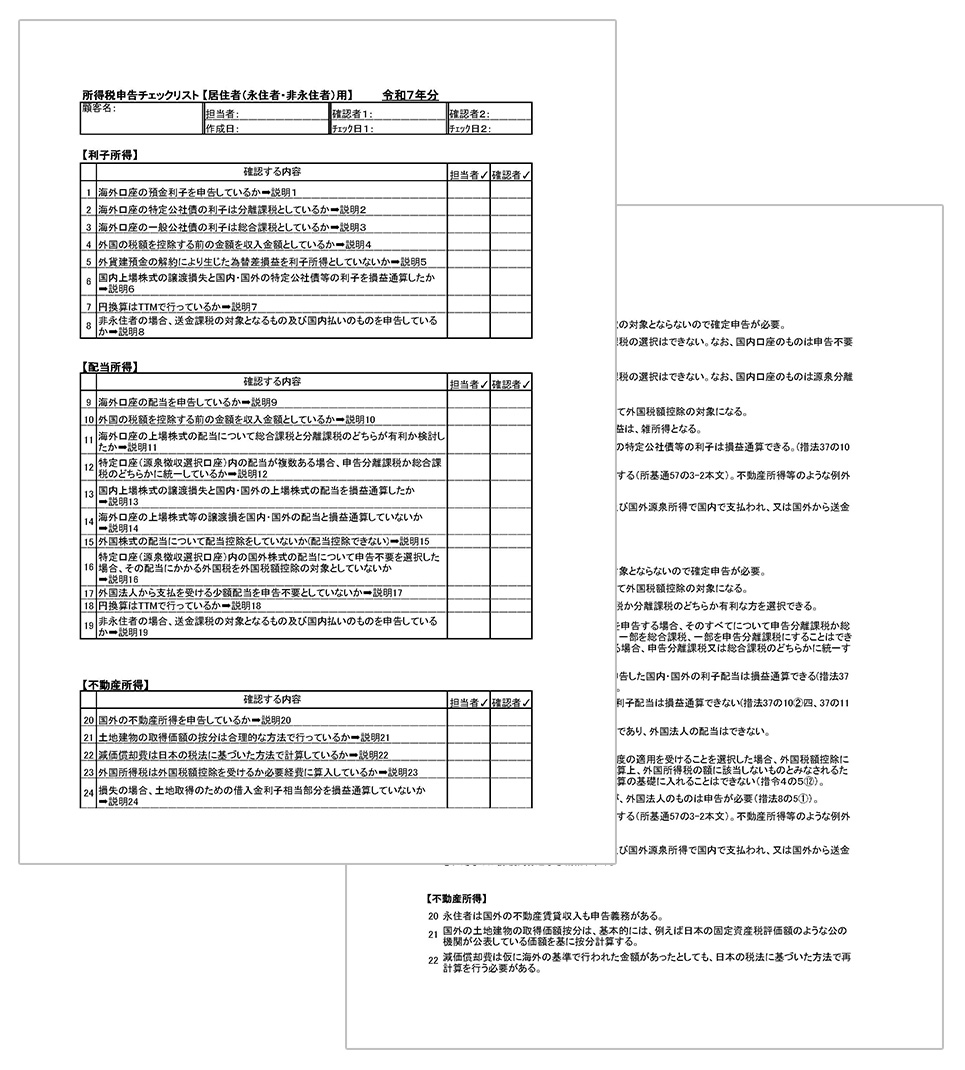 「永住者・非永住者」と「非居住者」でシートを分け、それぞれのステータス特有の論点(国外送金、短期滞在者免税、PEの有無など)を詳細に網羅しており、ゼロから調べる時間が削減され、申告書作成までのリードタイムを大幅に短縮できます。
