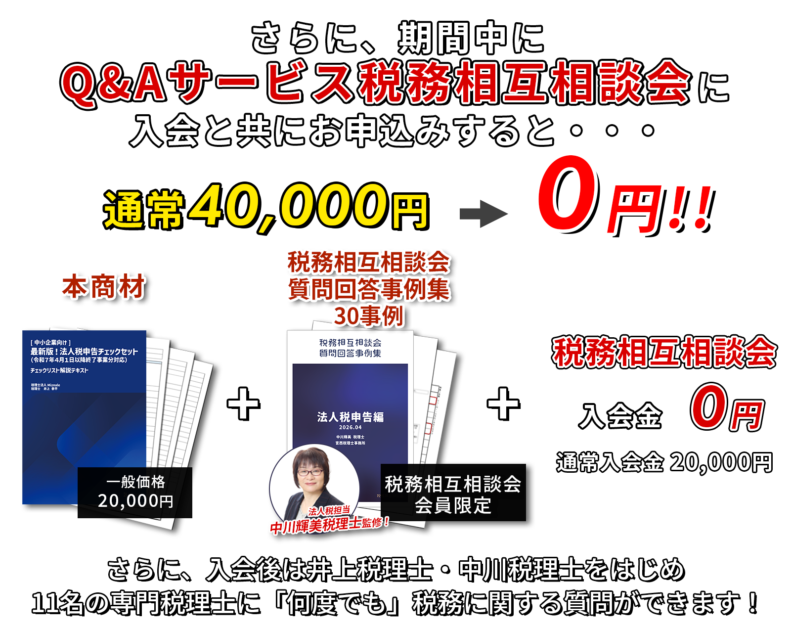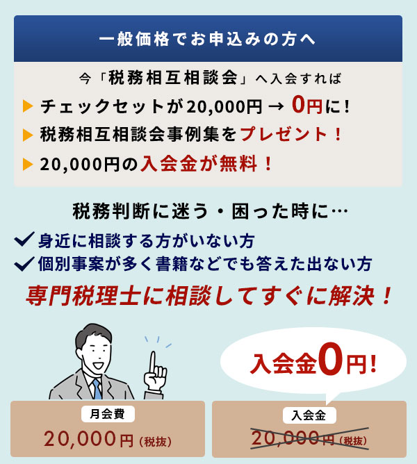 なお、この機会に「税務相互相談会」に入会すると本商材が無料になることに加えて、各税目の専門税理士に税務判断の迷いが何度でも質問できます。