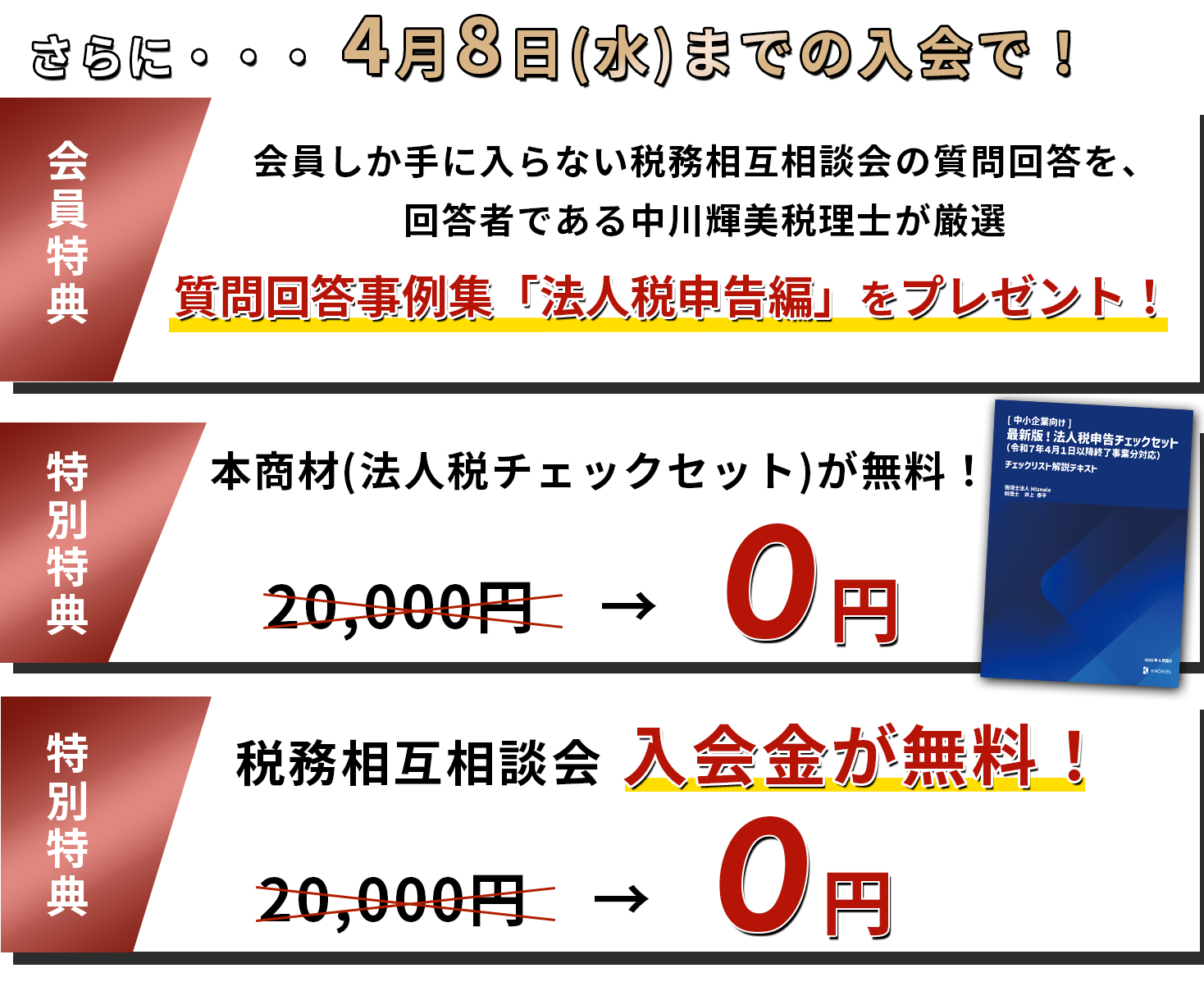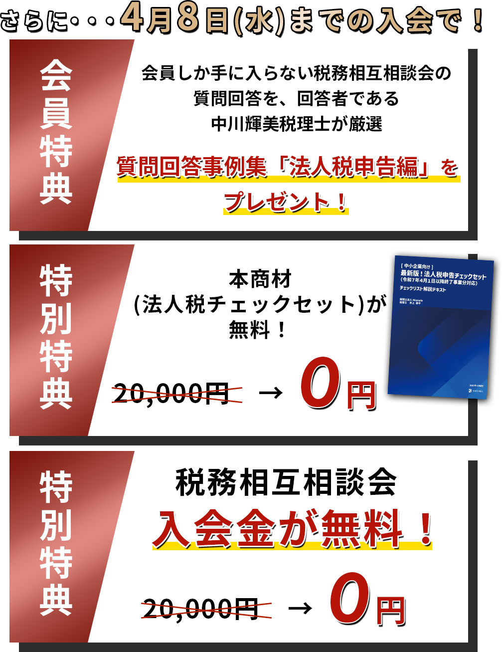 アカデミースタンダード・プレミアム会員の方は一般価格で購入いただけますが、4月8日まで税務相互相談会へのご入会で、無料でお届けいたします。