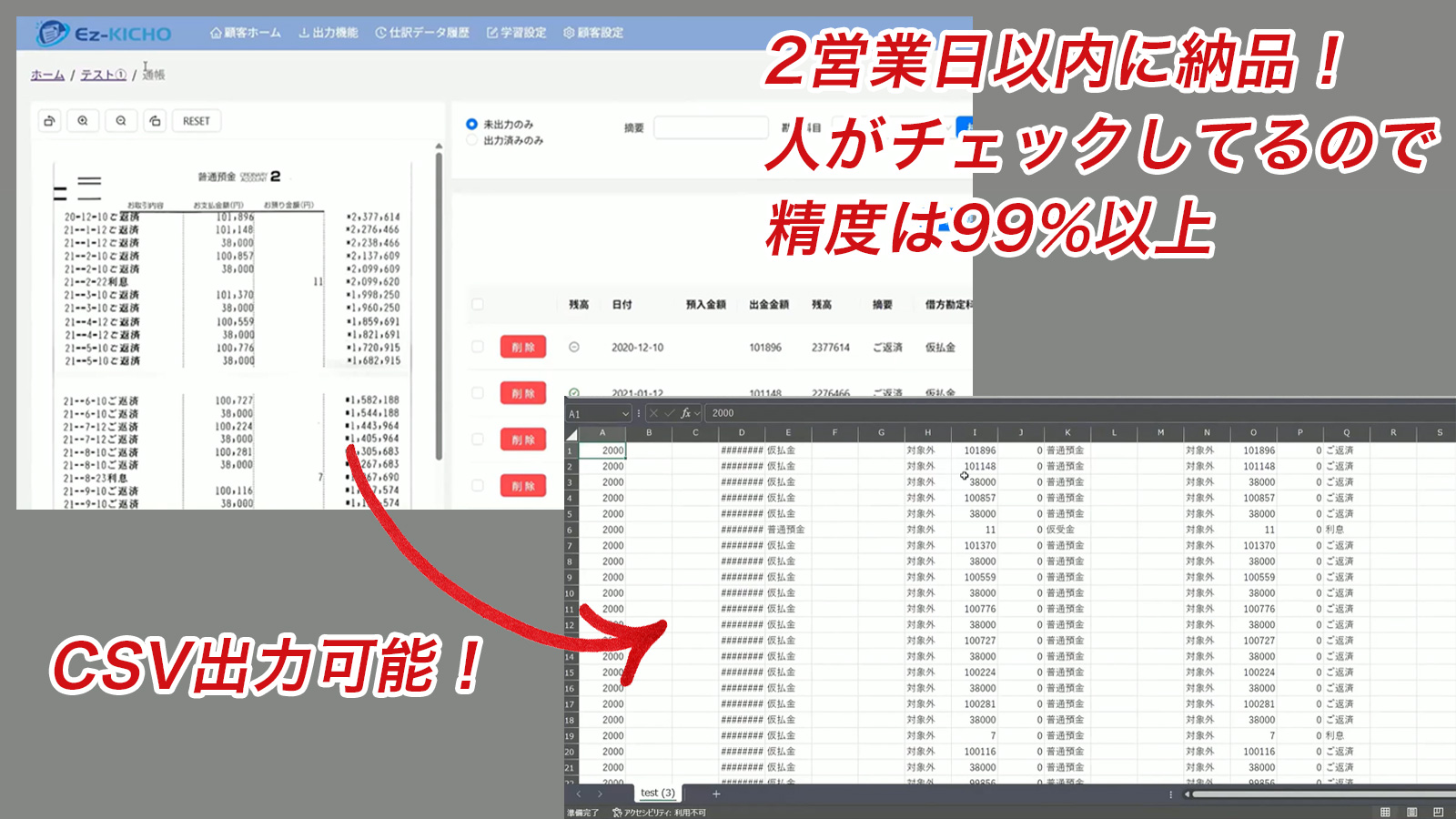 スキャンまたは写真に撮った通帳や領収書を自動で読み取り、さらに人の目でチェックをかけて、仕訳データを納品します!