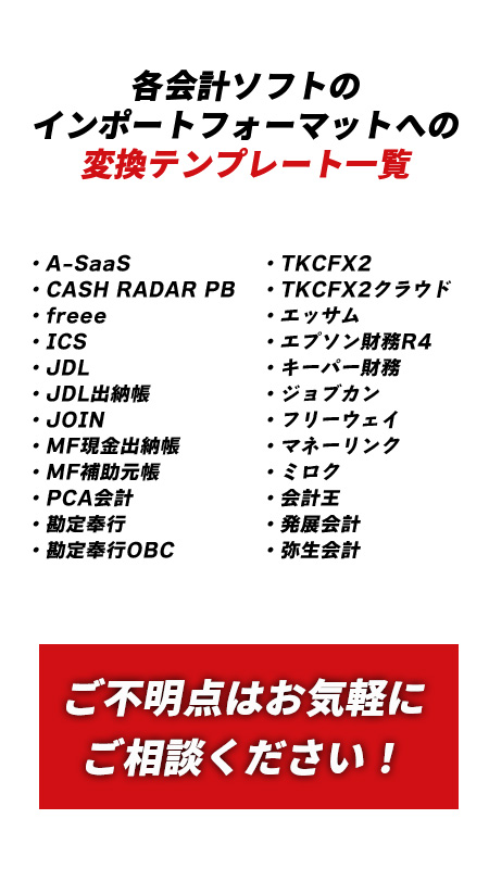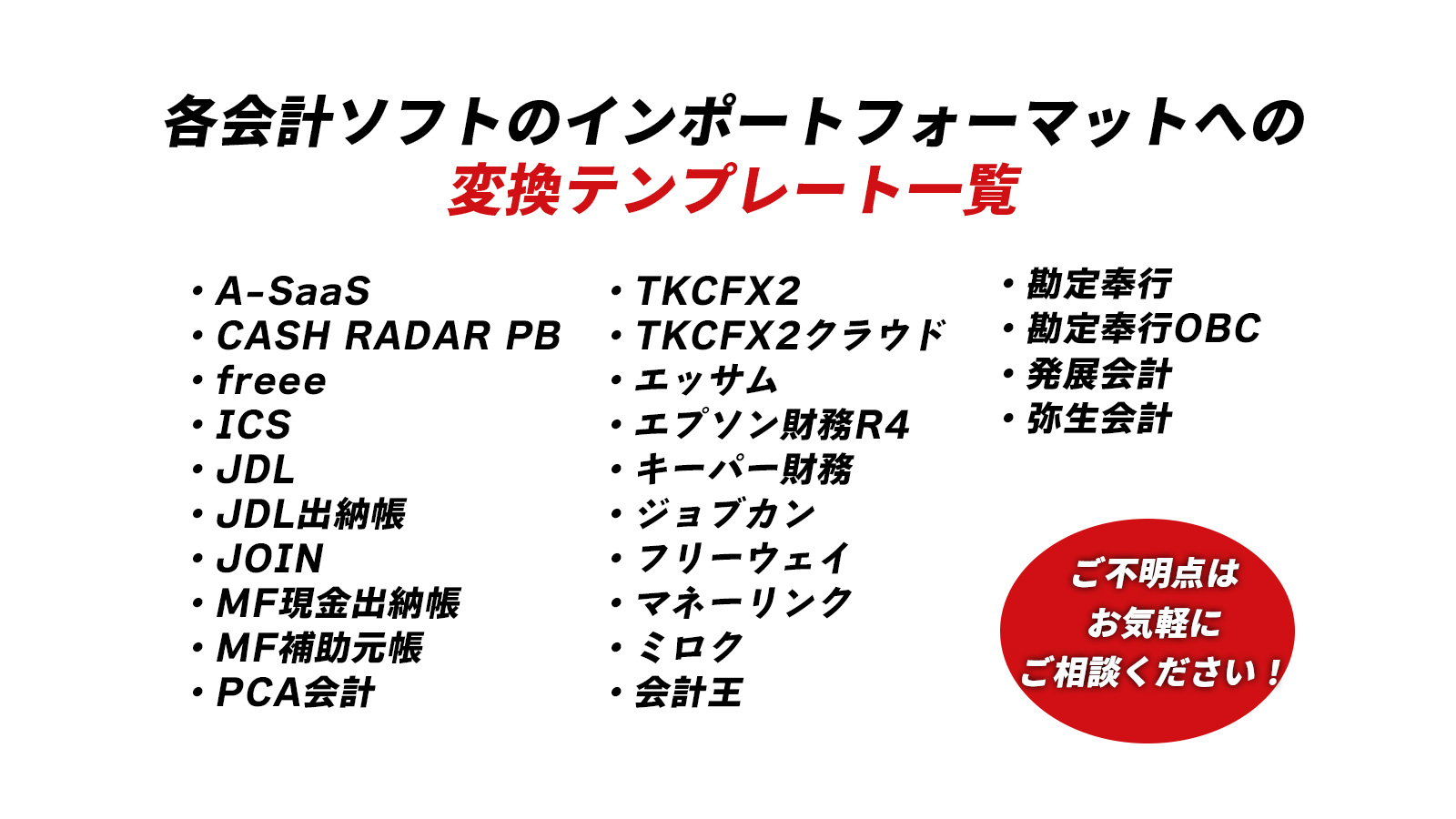 ●弊社が用意している各会計ソフトのインポートフォーマットへの変換テンプレートを活用