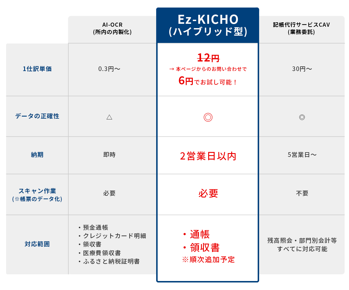 Ez-KICHOでは、例外パターンは皆さまに手動での修正をお願いするケースがありますが、基本パターンを低価格で処理できることを目指しています。