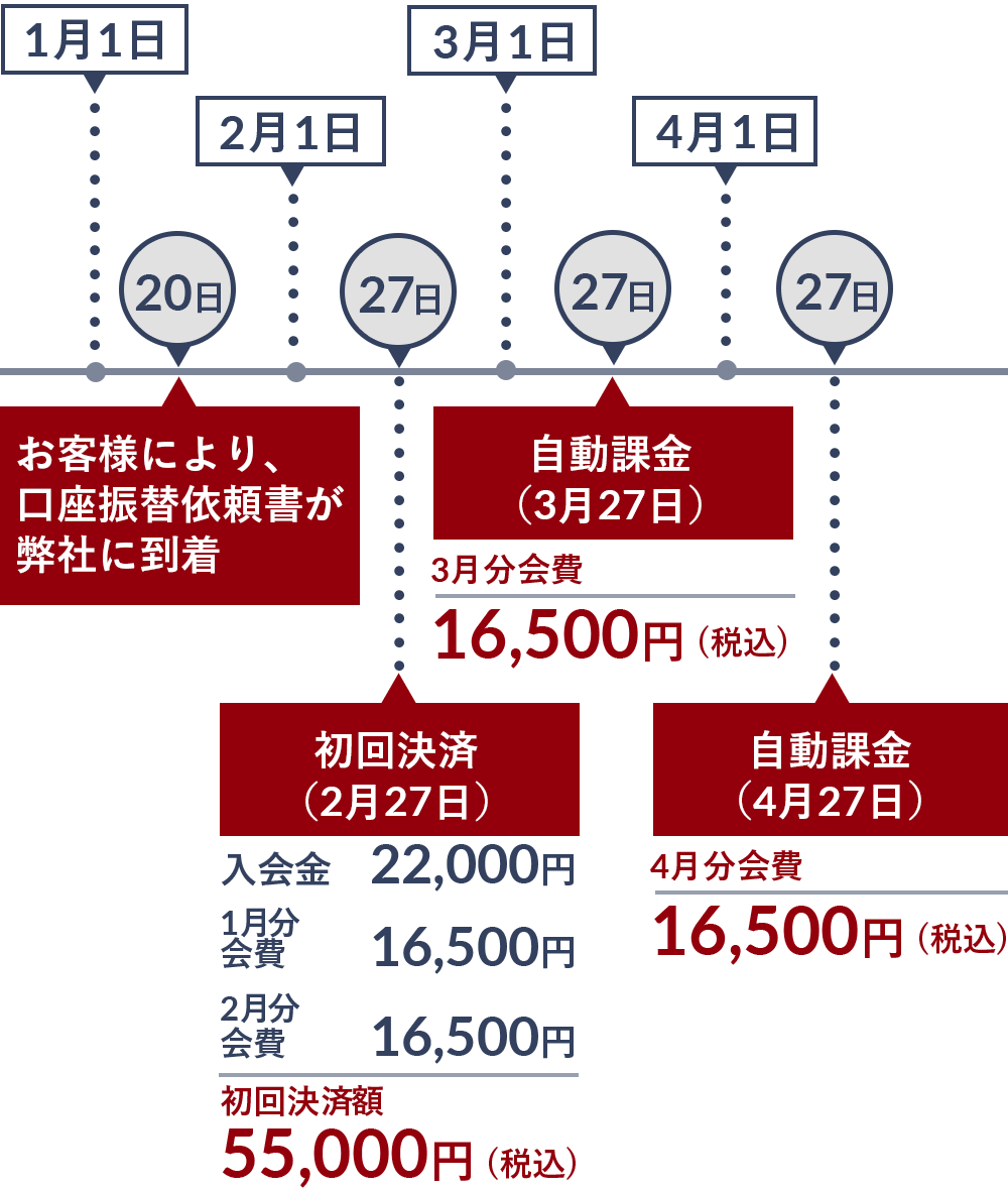 - 当会の入会金は22,000円(税込)とします。お支払はクレジットカードまたは口座振替によるものとします。また、クレジットカードの明細をもって、弊社からの領収書とさせて頂き、口座振替の場合は領収書を発行しません。